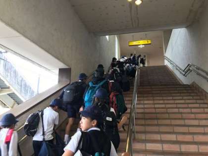 磯部駅に到着しました。これから、バスでスペイン村に向かいます。あいにく、小雨が降ってきましたが、全員カッパを着て、備えています。