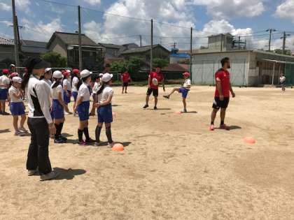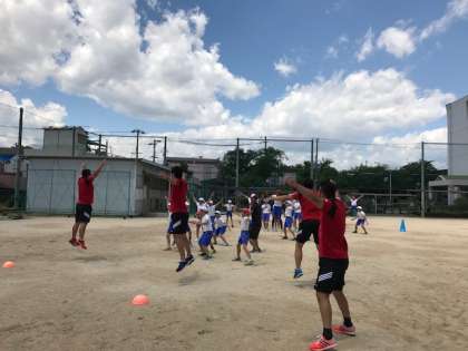 少しずつ、ラグビーらしさを取り入れた運動を教えてもらいました。今度はボールをキックしてバトンタッチです。一番遅かったチームは罰ゲームとして「キラキラジャンプ」をしましたが、あまりに楽しそうなので、早かったチームからも参加者が大勢いました。