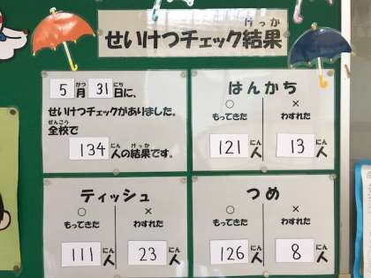 またその横には、先日の清潔チェックの結果が張り出してありました。今年度から、予告なしで「ハンカチ・ティッシュの所持と、爪を切っていること」の調査をしています。そのためか、ティッシュ所持率は少々低めの83%でした。爪は94%もの人がきちんと切っていましたが、6月21日からはプールも始まります。自分と友だちの安全のためにも、爪を短く切るようにしましょう。