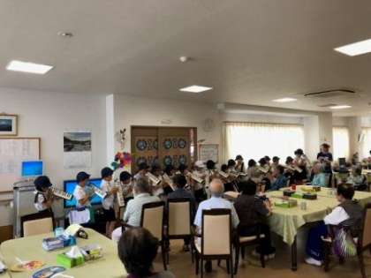 福町のデイサービスセンターでは、デイサービスのお仕事に関する質問をしたあと、鍵盤ハーモニカで2曲、歌を1曲聞いていただきました。あたたかい拍手をもらって、子どもたちもうれしそうでした。