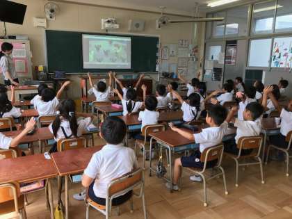 午後1時45分からの、英語モジュール授業、Fukuタイムでは、どの児童もビデオに合わせて、英語の歌をうたっています。写真は子どもたちも大好きなお母さんアヒルと子どもアヒルの歌で、みごとな発音で子どもアヒルの数を数え、右の翼(right wing)、左の翼(left wing)、両方の翼(both wing)と振りをつけて歌っています。