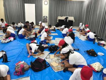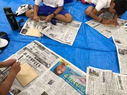 にわか雨のため、森のホールで竹箸を作りました。林間学舎の間、ずっと使うお箸です。ケガもなく、ナイフを上手に使って、思い思いの模様を刻みました。このお箸を使っていただく晩ご飯が楽しみです。