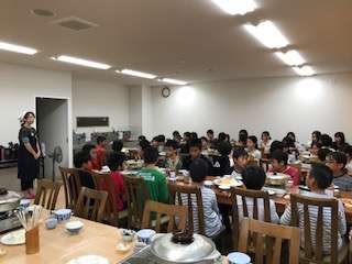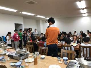 食事係のみなさんのあいさつで、一同いただきますをしました。つづいてやまなみさんから、鴨鍋のおいしい食べ方を教えていただきました。