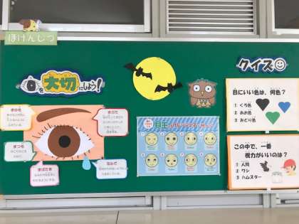 10月10日は目の愛護デーということで、保健室の先生が保健室前に目を大切にすることを呼び掛ける掲示をしてくれました。勉強に、読書、テレビ、インターネットやゲームなど目は大忙しで、起きている間ずっと働いています。一生お世話になる目です。この掲示にあるように、時にはマッサージもして、大切にしましょう。目をギュッとつむったり、ぱっと見開いたり。目玉をぐるぐる回したりすることで、目や目の周りの筋肉の血行がよくなり、目の疲労がとれ、よく見えるようになるそうですよ。