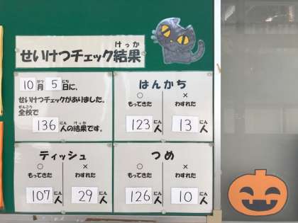 横には清潔チェックの結果が書いてありました。去年、みんなよくできていたので、今年度はいつ調べるか予告なしで清潔チェックを行っています。これで100%できたらあなたの清潔習慣は本物です。爪きり、ハンカチとティッシュの携帯、意識せずにできるようになりたいものです。