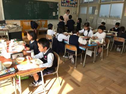 今日の給食は大阪の学校ならでは!のお好み焼きでした。「ごはんにお好み焼きって、炭水化物ばっかりの食事だね」と、よくテレビなどで揶揄されていますが、卵に山芋、そしてキャベツたっぷり、かつおや青ネギまで入ったお好み焼きは完全栄養食品かも知れません。豚肉と野菜たっぷりの豚汁と梅風味のきゅうりもついていて、子どもたちは大喜びでした。