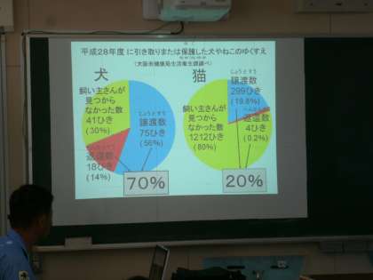 日本国内で、15歳以下の子どもの人数より、ペットとして飼われている犬・猫の頭数が多くなってから約10年。ペットの命も大切にしようということで、大阪市健康局動物管理センターの方々が「いのちの授業」をしてくださいました。