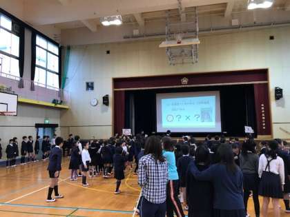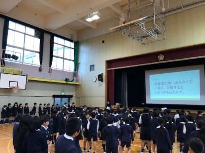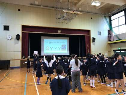 10月27日から11月9日は全国読書週間です。今朝の児童集会ではこれにちなんで、図書委員会のみなさんが ○×クイズを出題してくれました。読み聞かせボランティアさんが来られる曜日、図書室にある椅子の数、ぬいぐるみの数、そして本の数、人気の本など、えー知らなかったというような問題も出ました。子どもたちも楽しんで参加し、正解した児童は飛び跳ねて喜んでいました。