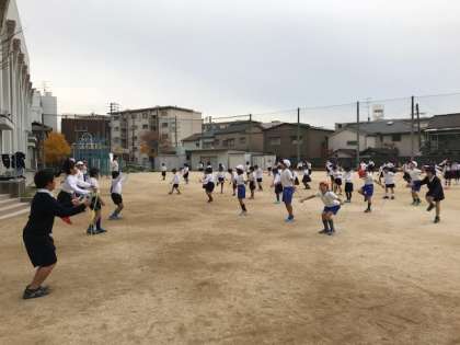 今日のなわとび運動は低学年です。雨が近いのか、空が曇ってきてうすら寒い運動場ですが、子どもたちはみんながんばってなわとびをしています。インフルエンザが流行りだしていますが、寒さに負けず身体を動かして、体力をつけましょう。