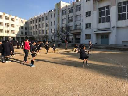 今朝の児童集会は、先週に続いてたてわり班で長なわとびをしました。ひとりずつ順番に、なわをとぶかくぐるかして、決められた時間内に何回できるかを競い合いました。順番が来ても、勇気を出さないとなかなか挑戦できないようでしたが、高学年の子どもたちが手をつないだり、声をかけたりしてみんなで楽しめるよう工夫していました。