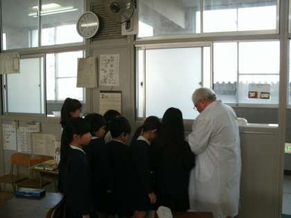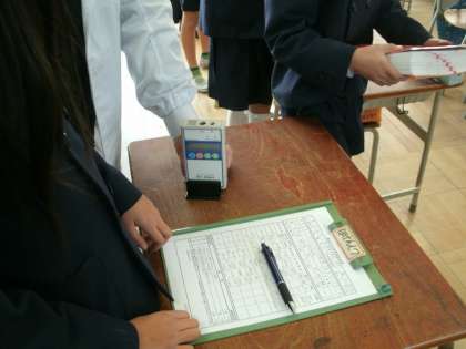 学校薬剤師の先生に、教室の空気検査をしていただきました。先生が準備をしていらっしゃるのを見つけた子どもたちは興味津々でした。