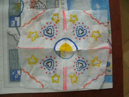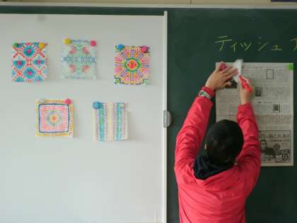 図画工作の時間に3年生がティッシュアートに挑戦しました。ティッシュペーパーを1枚はがして、好きなように折り畳み、水性ペンで色を付けていきます。子どもたちは呑み込みも早く、思い思いに個性豊かな作品を作っていました。出来上がって広げる時がとても難しく、破れてしまってがっかりするシーンもありましたが、気を取り直してまた次の作品に取り掛かっていました。出来上がった作品は、刺し子の刺繍のようで、不思議な味わいがあります。すぐできるので、おうちでもやってみられてはいかがですか。
