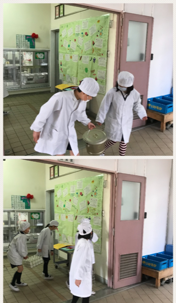 給食を運んでいるのは、今日一番乗りした3年1組の子どもたちです。