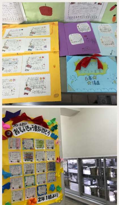今日の給食はハヤシライス、キャベツのひじきドレッシングがけ、缶詰みかんで、子どもたちに大好評でした。給食室の壁には給食調理員さんたちが、先週児童のみなさんが調理員さんたちに贈った感謝のメッセージを、きれいに貼ってくださっていました。こころのキャッチボールって、こういうことなのですね。
