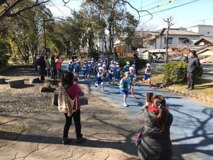 風もなく暖かな日差しに恵まれた今日、インフルエンザ大流行のあおりで、延期になっていたかけあし大会を行いました。平日にも関わらず、緑陰道路には大勢の保護者や地域の方々が応援に来てくださいました。