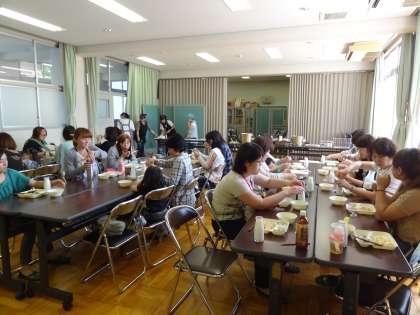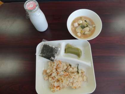 栄養教諭から「骨太人生を目指そう」の講演後、本日の給食【かやくご飯・みそ汁・まっ茶ういろう】をいただきました。かやくご飯には具がたくさん入っていて、素材の味を堪能でき、はしがとっても進みました。