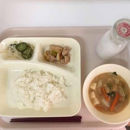今日の献立は、ご飯、牛乳、焼きとり、みそ汁、きゅうりともやしのゆずの香あえでした。
