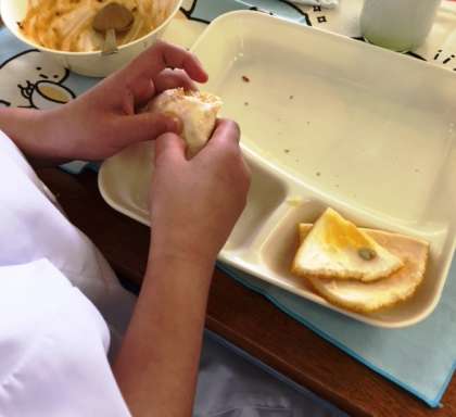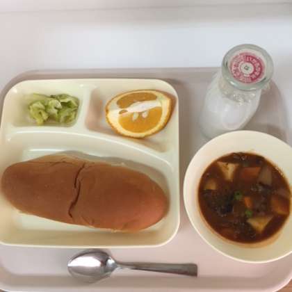 今日の献立は、黒糖パン、ビーフシチュー、キャベツのピクルス、甘夏かんでした。