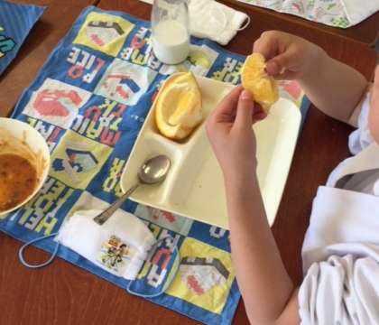 甘夏かんは、今が旬の果物です。少し食べにくいですが、子どもたちは頑張って皮むきに挑戦していました。