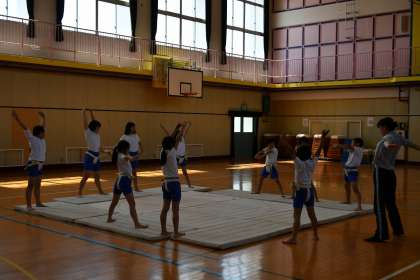 5月3日(木・祝)にエディオンアリーナ大阪にて、「熱狂、わんぱく相撲大阪市大会」が開催されます。本校からは11名がエントリーしています。今日の昼休みに、講堂で練習を行いました。みんな気合入っています。