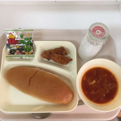 今日の献立は、黒糖パン、牛乳、一口トンカツ、ミネストローネ、豆こんぶでした。
