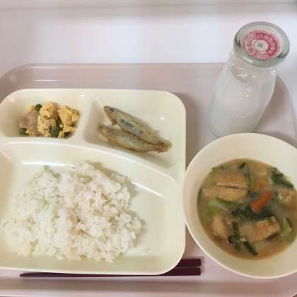 今日の献立は、ご飯、牛乳、きびなご天ぷら、みそ汁、えんどうの卵とじでした。