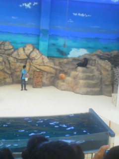 水族館でアシカショーを見ています。普段見ることができないので、みんな嬉しそうです。