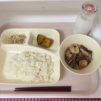 今日の献立は、ご飯、牛乳、すき焼き煮、焼きかぼちゃの甘みつかけ、もやしのごま酢あえでした。