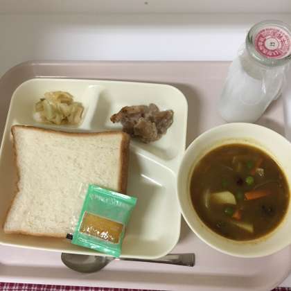 今日の献立は、食パン、りんごジャム、牛乳、鶏肉のガーリック焼き、ビーンズカレースープ、サワーソテーでした。ビーンズカレースープは、金時豆を使用しています。豆は、苦手という子どもが多い食材ですが、カレーに加えることで食べやすくなります。