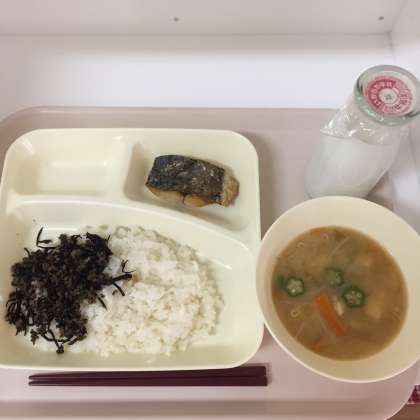 今日の献立は、ご飯、牛乳、さごしの塩焼き、みそ汁、牛ひじきそぼろでした。