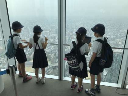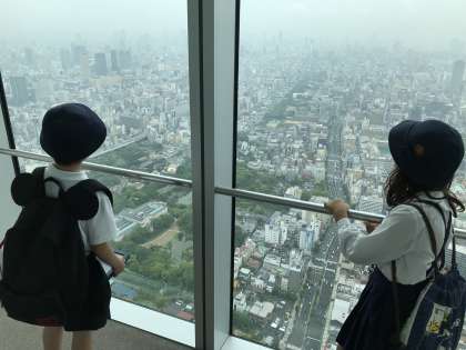 高い所から見る大阪に、子どもたちも大はしゃぎでした。ユニバーサルスタジオや通天閣、天王寺動物園を探す人もいれば、淀川や大阪湾、大和川を探す人もいました。探したところは、タブレットで写真を撮り、学校に戻って授業で使います。電車の中も、他の人に迷惑をかけないよう、ルールの勉強もしました。