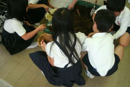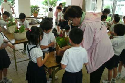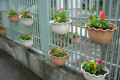 2年生は、今日、地域の「福町なごみクラブ」の皆さんと、花の植え替えを行いました。小さな鉢から大きな鉢へ植え替えます。肥料の入った土をその時に入れて、新しい鉢の土をならして、正門横の柵にかけました。とてもかわいい花です。学校へ来られた時、横を通られた時、見てください。2年生、頑張りました。後片付けも頑張りました。