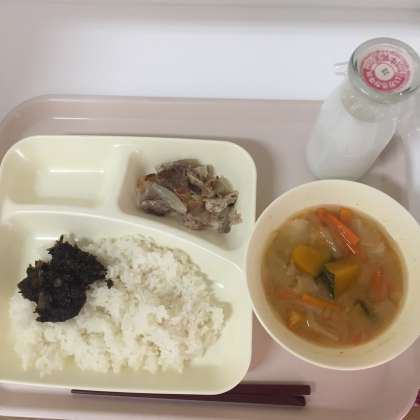 今日の献立は、ご飯、牛乳、豚肉のゆずの香焼き、みそ汁、のりの佃煮でした。