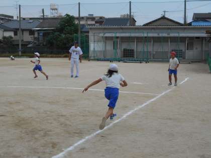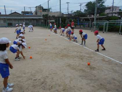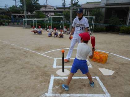 今日、3・4年生は、オリックス・バファローズの方と一緒にティ−ボールの学習をしました。ティーボールとは、止まっているボールを打つ、野球によく似たゲームで、空振りがほとんどなく誰でもボールを打つ楽しさを味わえるゲームです。最初に説明をしていただき、準備運動の後、体をならして、いよいよ本格的にプレーボール。元気な子供たちは、普段よりさらに元気に体を動かしました。