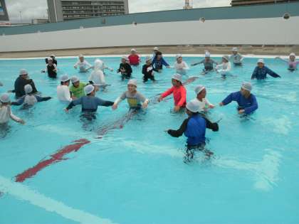 今日の4時間目、5・6年生は着衣水泳を行いました。普段行っているプールの授業ではなく、夏休みに海や川へ行った時、溺れたり、水の事故に会った時の対応を学習しました。普段の水着の上に、普段の服を持って登校。いつもとは違う授業で戸惑った表情を見せていました。授業の中では、服を着たままの浮き方や、ペットボトルを活用して、体を浮かす方法を学習しました。使うことがあってはならないのですが、知識として知っておきましょう。