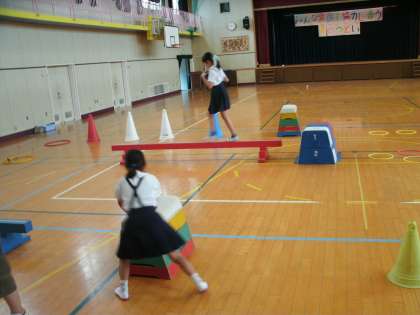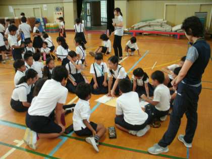 内容は「体内時計:時計を使わず、10秒を図るゲーム」、「ボール投げ:各点数の記された箱にボールを投げます」、「めいろ:図書室が迷路になりました」、「ボーリング:多目的室がボーリング場になりました」「スプーンリレー:講堂で、障害物をクリアしながらスプーンリレーをします」の5つが披露されました。どの子も笑顔で楽しそうです。上級生はやんちゃな下級生をまとめ、下級生は自分たちが数年後、今の上級生を見て、大きく成長していく手本にしていました。終わったら、講堂で各班で反省会です。もっと面白くするにはどうしたらよかったのかな?でも、楽しかったです。シークレットは校長先生からのシールのプレゼントでした。