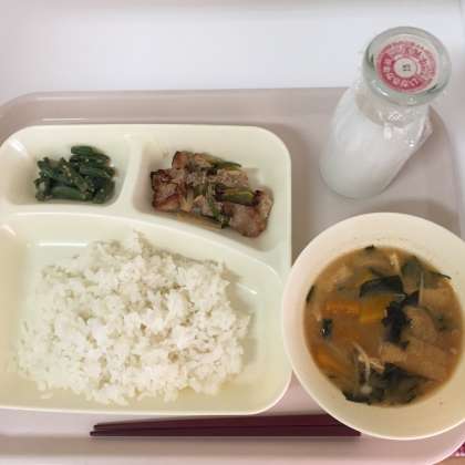 今日の献立は、ご飯、牛乳、豚肉とピーマンのしょうが焼き、かぼちゃのみそ汁、三度豆のごまあえでした。