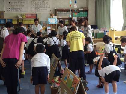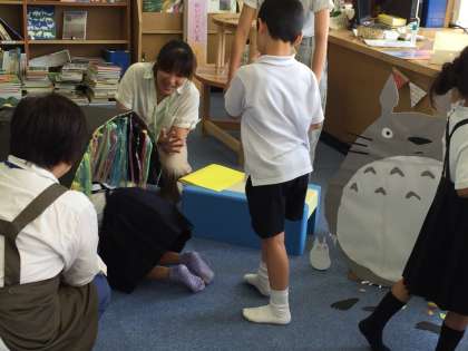 残りの時間は、自分たちで絵本を選び、読書タイム。図書館補助員の方や「ハッピーブックちゃん」の方々、担任の先生に読み聞かせをしていただいた子どももいました。最後に「ハッピーブックちゃん」の皆さんからとてもかわいいプレゼントがありました。みなさんにお礼を言って、トンネルをくぐって、絵本の世界を後にしました。