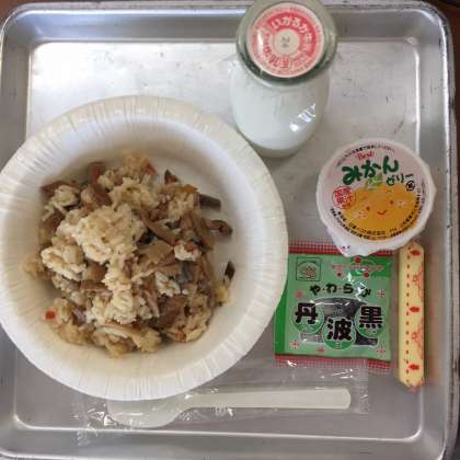 今日の献立は、かやくごはん、牛乳、ソフト黒豆、棒チーズ、みかんゼリーでした。