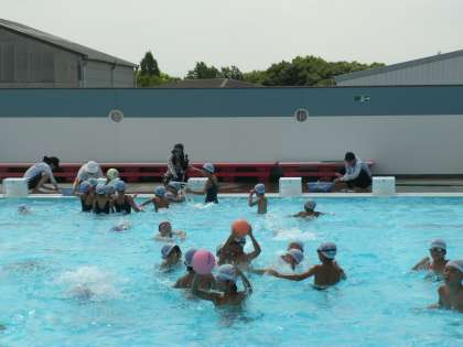 プール開放、2日目、4〜6年生の様子です。初めに泳法指導を受けて、その後3学年で自由時間です。水中バスケットを行いました。とても楽しそうです。暑いですが、気持ちよさそうです。水中とはいえ、熱中症にもなりやすいです。プールからあがっても、水分補給をしっかりしてくださいね。PTAの当番のお母さん方、暑い中、ありがとうございます。あと一日よろしくお願いいたします。