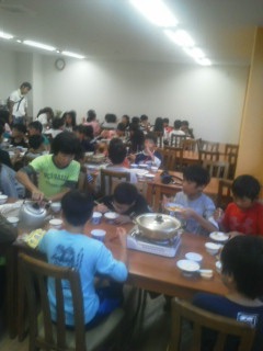 お風呂も入って、さっぱりしました。夕食です。メニューは豚味噌鍋です。みんなと食べる夕食は、いつもと違って、楽しくて、更においしく感じます。
