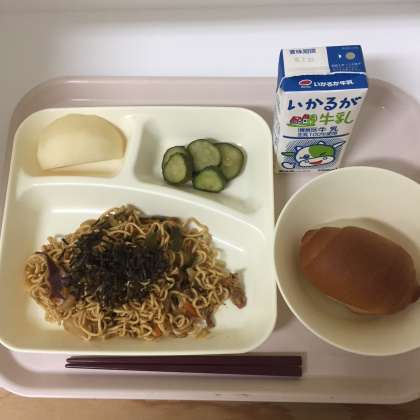 今日の献立は、黒糖パン、牛乳、焼きそば、きゅうりの甘酢づけ、梨でした。