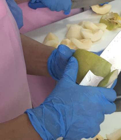 季節の果物、梨が登場しました。「二十世紀」という品種の梨です。皮をむき、1年生と2年生にはさらに小さく切って、食べやすくしていただきました。