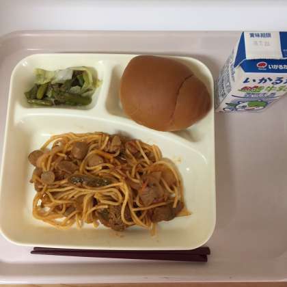 今日の献立は、黒糖パン、牛乳、イタリアンスパゲッティ、グリーンアスパラガスとキャベツのサラダでした。