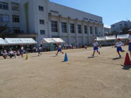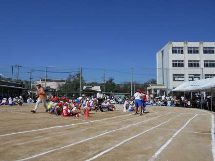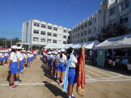 9月30日(日)予定だった運動会でしたが、台風24号のため、10月3日(水)に延期となりました。この日は、とてもいいお天気でした。開会式では全校児童の入場行進から始まり、「心をひとつにして、全力を出しきろう!」のスローガンをみんなで掲げました。力強い児童宣誓を行い、競技がスタートしました。