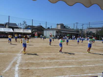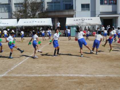 中学年の団体演技「なかまとともに」です。使用した楽曲は、いろんな国のヒット曲をリミックスしたものです。楽しそうに踊っています。