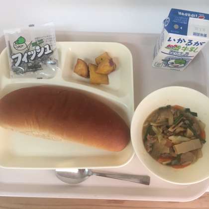 今日の献立は、黒糖パン、牛乳、豚肉といかの中華煮、大学いも、ミニフィッシュでした。