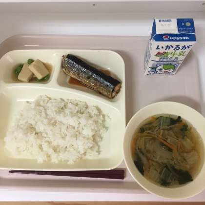 今日の献立は、ご飯、牛乳、さんまのさんしょう焼き、すまし汁、高野豆腐の煮物でした。