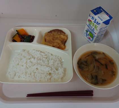 今日の献立は、ご飯、牛乳、和風おろしハンバーグ、みそ汁、かぼちゃのいとこ煮でした。