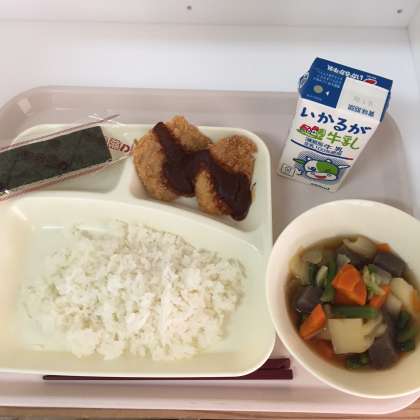 今日の献立は、ご飯、牛乳、みそカツ、じゃがいもと野菜の煮物、焼きのりでした。